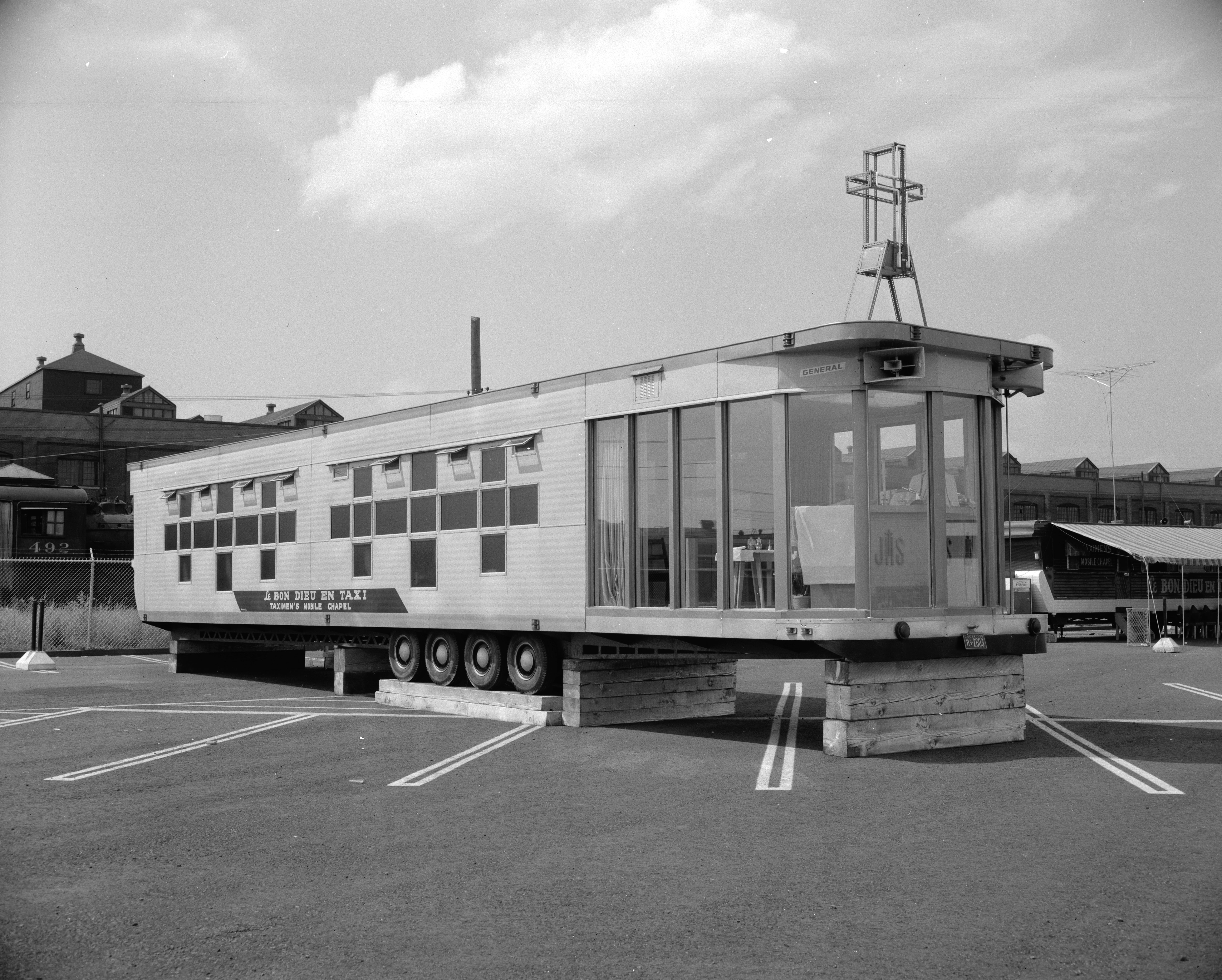 L’œuvre du Bon Dieu en taxi est si populaire qu’une deuxième roulotte est rapidement nécessaire pour soutenir sa mission religieuse. Assemblée par la General Coach Works of Canada selon les indications du père Aquin, la « roulotte-cathédrale », comme il l’appelle, arrive tout droit de l’Ontario à Montréal en 1959. Sa longueur de 55 pieds en fait la plus grande remorque jamais construite au Canada. On ne peut pas la manquer : ornée de vitraux des deux côtés, elle arbore un affichage bilingue, « le Bon Dieu en taxi » et « Taximan’s Mobile Church ». Elle peut accueillir 60 personnes assises et 125 debout. Toutefois, la plupart des fidèles (200 000 en à peine deux ans, jusqu’à environ 450 000 en 1964), qui ne conduisent pas tous des taxis, apprécient la possibilité d’écouter la messe amplifiée par des haut-parleurs placés à l’extérieur, dans le confort de leur voiture. Ceux qui souhaitent communier signalent leur intention avec leurs phares. Il faut dire que la mission est ouverte à tous. D’autres catégories de travailleurs fréquentent les roulottes qui sont ouvertes de 11 h 40 du matin à 4 h dans la nuit. On pense aux employés de radio et de télévision, des clubs de nuit, des hôtels, aux chauffeurs de camion, etc.